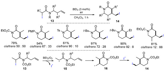N-Allyl-haloacetamides have been used as the substrates for ATRC to make N-containing heterocyclic compounds. A BEt3/O2-initiated iodine-atom-transfer radical cyclization of N-(but-3-en-1-yl)-N-(tert-butyl)-2-iodoalkanamides for the synthesis of iodine substituted δ-lactams has been reported by Li, Liu and their coworkers in 2016. The reaction of N-(but-3-en-1-yl)-N-(tert-butyl)-2-iodoalkanamides 13 in the presence of BEt3 and air for 1 h afforded products 14 in good yields (Scheme 7) [32]. In this reaction process, radicals 15 formed via the abstraction of iodine atom of 13 by BEt3 undergo the 6-exo cyclization to give radicals 16 followed by coupling with iodine radical to form products 14.