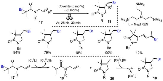 In 2020, Bolm and co-workers reported a mechanochemical reaction of N-allyl- 2-bromo-propanamides for the synthesis of brominated lactams. The reaction of N-allyl-2-bromo-propanamides 17 in the presence of the mineral covellite and tris[2-(dimethyl-amino)ethyl]amine (Me6TREN) under mechanochemical conditions in ball mills gave 18 in good to excellent yields (Scheme 8) [33]. The reaction of N-allyl-2-bromo-propanamides 17 and [CuIL] generated from covellite and Me6TREN afford radicals 19 which undergo 5-exo cyclization to give radicals 20 followed by bromide atom transfer from [CuIIL]Br to close the catalytic cycle and form products 18. In another paper, Bolm and co-workers conducted similar reactions but modified the reaction conditions by using Cu(OTf)2, tris(2-pyridylmethyl)amine (TPMA) and tet-BaTiO3 to give brominated lactams in good yields [34].