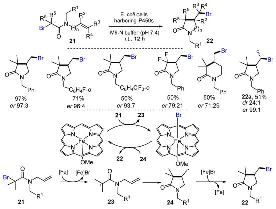 In 2021, Yang and coworkers developed cytochromes P450 metalloenzyme-catalyzed radical cyclization reactions of bromo-propanamides for the synthesis of nitrogen heterocycles. The reaction of 2-bromo-propanamides 21 in the presence of whole-cell biotransformation E. coli cells resuspended in M9-N buffer (pH 7.4) at room temperature gave products 22 in good yields (Scheme 9) [35]. γ-Lactam product 22a was obtained in a good diastereomeric ratio of 24:1 which is better than the traditional Cu(OTf)2/TPMA catalysis of 64:36 diastereomeric ratio [34]. In this metalloenzymatic reaction process, radicals 23 formed by the reaction of N-allyl-2-bromo-propanamides 21 and [Fe] undergo 5-exo cyclization to give radicals 24 which abstract Br from [Fe]Br to give products 22.