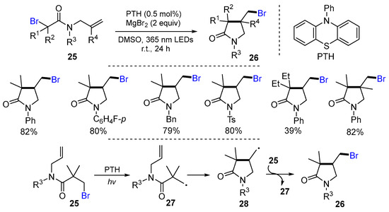 Nishikata and coworkers, in 2021, reported a photo-induced radical reaction of N-allyl-α-haloamides for the synthesis of γ-lactams. The reaction of N-allyl-α-haloamides 25 in the presence of N-Ph-phenothiazine (PTH) and MgBr2 in DMSO under the irradiation of 365 nm LEDs at room temperature for 24 h gave products 26 in good to excellent yields (Scheme 10) [36]. The reaction first generates radicals 27 from the reaction of N-allyl amide 25 with PTH under the irradiation of LEDs. The cyclization of radicals 27 gives radicals 28 which trap the Br radical from N-allyl amides 25 to give products 26.