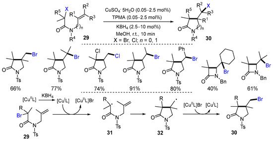 Clark and coworkers reported a Cu-catalyzed ATRC reaction of halo-olefins for the synthesis of nitrogen heterocycles in 2012. The reaction of N-allyl-haloacetamides 29 in the presence of CuSO4·5H2O, TPMA and borohydride salts at room temperature for 10 min gave products 30 in good yields (Scheme 11) [37]. The proposed mechanism suggested that [CuIL] produced from the reduction in [CuIIL] with KBH4 reacts with 29 to form radicals 31 followed by the cyclization to give radicals 32. Final products 30 are obtained from the reaction of radicals 32 and [CuIILBr] along with the regeneration of [CuIL].