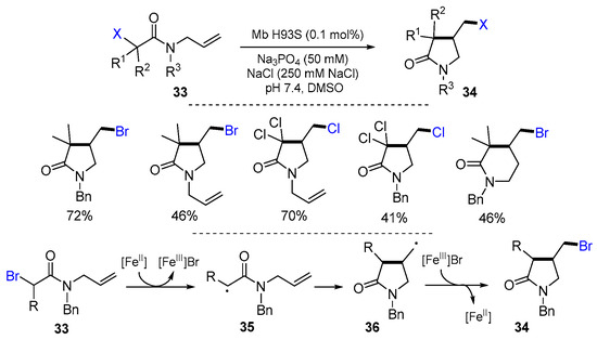 Pellizzoni and coworkers reported a myoglobin-catalyzed reaction of N-allyl-α-haloamides for the synthesis of γ-lactams in 2022. The reaction of N-allyl-α-haloamides 33 in the presence of Mb H93S (as purified protein and in whole bacterial cells), sodium ascorbate, and sodium phosphate buffer (pH 7.4) produced products 34 in good yields (Scheme 12) [38].