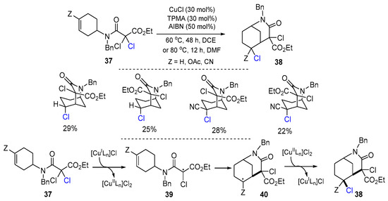 Diaba, Bonjoch and coworkers, in 2014, reported a Cu-mediated ATRC reaction of aminotethered dichloromalonamides for the synthesis of 2-azabicyclo[3.3.1]nonanes. The reaction of aminotethered dichloromalonamides 37 (such as carbamoyldichloroacetate-tethered alkenes and α,β-unsaturated nitriles) in the presence of CuCl, TPMA and AIBN in DCE at 60 °C for 48 h or in DMF at 80 °C for 12 h afforded products 38 in good yields (Scheme 13) [39]. Radicals 39 generated from the reaction of 37 and [CuILn]Cl undergo a 6-exo cyclization to give radicals 40 which then trap the Cl radical from [CuIILn]Cl2 to give products 38 along with the regeneration of [CuILn]Cl.
