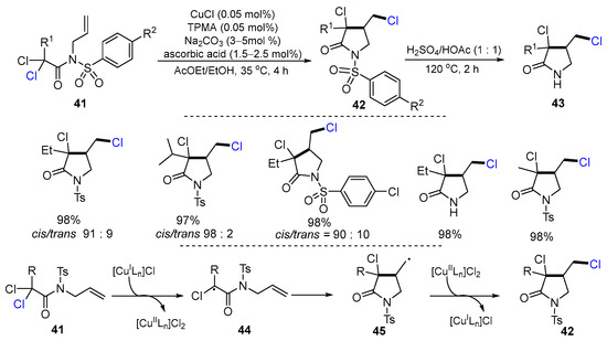 In 2014, Ghelfi and coworkers developed a Cu-catalyzed ATRC reaction of dichloromalonamides for the synthesis of nitrogen heterocycles. The reaction of N-allyl-N-tosyl-2,2-dichlorobutanamides 41 in a mixture of AcOEt/EtOH and in the presence of CuCl/TPMA/ascorbic acid/Na2CO3 gave N-arylsulfonyl-halo-γ-lactams 42 in good to excellent yields (Scheme 14) [40]. Next, 3-Pirrolin-2-one 43 could be generated after the deprotection of the N-tosyl-halo-γ-lactam 42. The proposed reaction mechanism suggested that radicals 44 generated from the reaction of 41 and [CuILn]Cl undergo a 5-exo cyclization to give radicals 45 which then react with [CuIILn]Cl2 to afford products 42 and [CuILn]Cl.