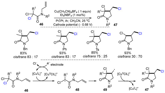In 2015, Isse and Gennaro and their coworkers reported an electrochemical reaction of N-allyl-α,α-dichloroamides for the synthesis of halogenated nitrogen heterocycles. The reaction of N-allyl-α,α-dichloroamides 46 was carried out in a cell assembled with a Pt gauze cathode and a Pt plate anode with the appropriate cathode potential value (often 0.68 V vs. SCE). In the presence of Cu(CH3CN)4BF4, TPMA, and Et4NBF4 in CH3CN at 25 °C under argon, the reaction gave products 47 in good to excellent yields (Scheme 15) [41]. In this reaction process, [CuIL]+ produced from the reduction in [CuIIL]+ at the electrode surface reacts with N-allyl-α,α-dichloroamides 46 to form radicals 48 which then undergo cyclization to form radicals 49 followed by the reaction with [ClCuIIL]+ to give products 47.