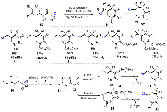 In 2016, Soni and Ram developed Cu-catalyzed radical cyclization reactions of N-allyl-N″-trichloro-acetylhydrazines for the synthesis of heterocyclic molecules containing two N-atoms. The reaction of N-allyl-N″-trichloroacetylhydrazines 50 in the presence of CuCl and pentamethyldiethylenetriamine (PMDETA) with DCE as solvent at refluxing for 2 h afforded a mixture of chlorinated tetrahydro-pyridazin-3-ones 51 and 1,2-diazepan-3-ones 52 in good yields (Scheme 16) [42]. Two different products were separated based on their solubility in n-hexane. The reaction of 50 with [CuIL]Cl first generates dichlorocarbon radical 53 via the abstraction of a chlorine atom by [CuIL]Cl to give [CuIIL]Cl2. Radicals 53 undergo a more favorable 6-exo cyclization to give radicals 54 followed by reaction with [CuIIL]Cl2 to give 6-membered products 51. Radicals 53 could also undergo less favorable 7-endo cyclization to form radicals 55 and then lead to the formation of 7-membered products 52.