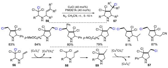 N-Allyl-haloamines are another class of substrate for ATRC that originates N-containing heterocyclic compounds. A Cu-catalyzed radical cyclization reaction of N-allyl-haloamines for the synthesis of substituted 2,4-trans-(NH)-pyrrolidines was reported by Gupta and coworkers in 2016. The reaction of 2,2,2-trichloro-ethylallyl- NH-amines 56 with CuCl and PMDETA with CH3CN as solvent at 0 °C gave products 57 in high yields (Scheme 17) [43]. The radicals 58 generated from Cl atom transfer of 56 cyclized to form radicals 59 followed by the reaction with [ClCuIIL]+ to give products 57.