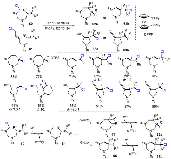 A protocol of Fe-catalyzed radical cyclization reaction of cloromethyl-1,6-dienes /1,6-enynes for the synthesis of nitrogen heterocycles was reported by Tong and coworkers in 2017. The reaction of chloromethyl-1,6-dienes/1,6-enyne 60 or 61 using DPPF [1,1’-bis(diphenylphosphino)-ferrocene] as a catalyst and PhCF3 as a solvent at 120 °C for 24 h gave products 62 or 63 in good yields (Scheme 18) [44]. In this reaction process, the abstraction of a chlorine atom from substrates 60 by DPPF leads to the formation of radicals 64 which undergo a 7-endo cyclization to form radicals 65, or a 6-exo cyclization to give radicals 66. The reaction of radicals 65 or 66 with Mn+1Cl afford products 62a or 62b.