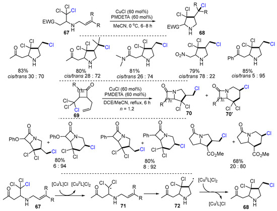 Sadanandan and Gupta, in 2020, developed Cu-catalyzed radical reactions of trichloroethyl allylamines for the synthesis of nitrogen heterocycles. The reaction of trichloroethyl allylamines 67 in the presence of CuCl/PMDETA at 0 °C in MeCN under N2 atmosphere gave products 68 in good yields (Scheme 19) [45]. While the reaction of allylamines 69 in refluxing DCE/MeCN under N2 atmosphere afforded a mixture of products 70 and 70′. In the reaction process, radicals 71 formed from 67 via the abstraction of a Cl atom by [CuIL]Cl undergoing a 5-exo cyclization to give radicals 72 which then lead to the formation of products 68 after coupling with [CuIIL]Cl2.