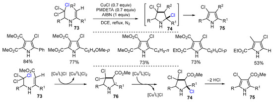 In 2019, Gupta and coworkers reported a Cu-catalyzed radical reaction of trichloroethyl-NH-enamine for the synthesis of multi-functionalized pyrroles. The reaction of trichloroethyl-NH-enamines 73 with CuCl, PMDETA and AIBN in refluxing DCE afforded products 75 in good yields (Scheme 20) [46]. The initial radicals formed via the abstraction of a Cl atom of 73 by [CuIL]Cl undergo a 5-endo cyclization to give radicals 76 followed by the Cl atom transfer from [CuIIL]Cl2 to give products 74. Sequential dehydrochlorinative aromatization of 74 leads to the substituted pyrroles 75.