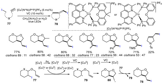There are several examples of using O-allyl-halo ethers as starting materials for ATRC to prepare O-containing heterocyclic compounds. Yu and Yang [47], in 2022, introduced a Cu-catalyzed radical reaction of unsaturated iodides for the synthesis of iodine-substituted heterocycles. The reaction of 2-allyloxy-3-iodotetrahydropyrans or tetrahydrofurans 77 in the presence of [CuI(N^N)(P^P)]PF6 complexes and ascorbic acid (VC) under the irradiation of blue LEDs in a mixture of CH3CN and H2O or in pure water afforded products 78 in good yields (Scheme 21) [47]. The initial radicals 79 produced from the reaction of 77 under either the photo-excited [CuI]* or the in situ generated [Cu0] species from [CuI]* undergo cyclization to form radicals 80 followed by iodine transfer to give products 78.