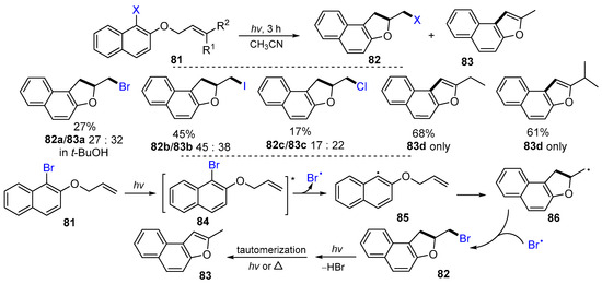 Yoshimi and co-workers, in 2014, reported a photo-induced radical reaction of allyl-bromonaphthyl ethers for the synthesis of naphtho[b]furans. The reaction of allyl-halo-naphthyl ethers 81 in CH3CN (or t-BuOH) under the irradiation of a 100 W high-pressure mercury lamp with a Pyrex glass filter (>280 nm) at room temperature for 3 h gave 2-halomethyl substituted naphthodihydrofuran 82 and naphtho[b]furans 83 in good yields (Scheme 22) [48]. The reaction involves the formation of triplet states of 84* from 81 under photo-irradiation followed by homolytic cleavage of C–X bond to give radicals 85 and Br radical. The 5-exo cyclization of radicals 85 gives radicals 86, followed by Br radical trapping to yield brominated products 82 which could undergo further dehydrobromination and tautomerization to give 83.