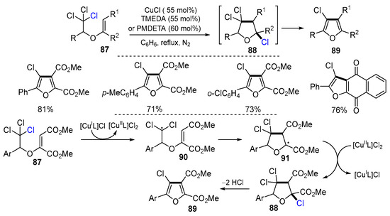 In 2016, Soni and coworkers reported a Cu-catalyzed cyclization of 2,2,2-trichloroethyl vinyl ethers for the synthesis of highly substituted 2,3-difunctionalized-4-chlorofurans. The reaction of 2,2,2-trichloroethyl vinyl ethers 87 in the presence of CuCl, and tetramethylethylenediamine (TMEDA) or PMDETA using benzene as solvent at reflux for 12–32 h gave products 89 in good yields (Scheme 23) [49]. Radicals 90, generated from 2,2,2-trichloroethyl vinyl ethers 87 via abstraction of a chlorine atom by [CuIL]Cl, undergo 5-endo cyclization to give radicals 91 which then lead to the formation of products 88 after trapping the Cl radical from [CuIIL]Cl2. Further transformation of 88 via aromative dehydrochlorination gives substituted furans 89.
