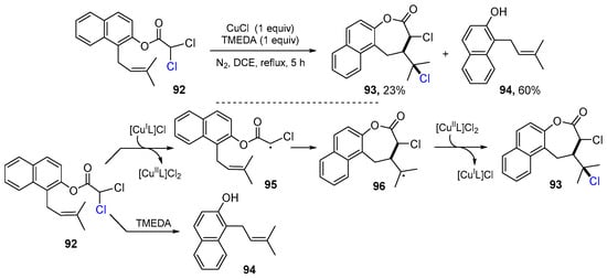 In 2018, the Tittal group reported a Cu-catalysed radical reaction of 1-(3-methyl-but-2-enyl)-naphthalen-2-yl ester for the synthesis of 7-membered lactones. The reaction of 1-(3-methyl-but-2-enyl)-naphthalen-2-yl ester 92 in the presence of CuCl/TMEDA in refluxing DCE for 5 h gave product 93 in 23% yield along with 1-(3-methyl-but-2-enyl)-naphthalen-2-ol 94 in 60 % yield (Scheme 24) [50]. Radical 95, generated from the homolytic C–Cl bond cleavage of 92, undergoes 7-exo cyclization to give radical 96, which then traps the Cl radical from [CuIIL]Cl2 to give product 93.