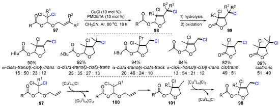 The use of O- or S-allyl-halo-hemiacetal acetates as substrates for ATRC could lead to the formation of cyclic hemiacetal compounds. In 2014, Roncaglia and coworkers introduced a Cu-catalyzed reaction of O-allyl-2,2-dichlorohemiacetal acetates for the construction of cyclic acetals and γ-lactones. The reaction of O-allyl-2,2-dichlorohemiacetal acetates 97 with CuCl and PMDETA in toluene at 80 °C for 18 h afforded cyclic acetals 98 in good to excellent yields (Scheme 25) [51]. The initial radicals 100 generated from the reaction of 97 and [CuILn]Cl undergo cyclization to give radicals 101 which couple with the Cl radical from [CuIILn]Cl2 to yield cyclic acetals 98. The cyclic acetals 98 could be readily hydrolyzed and oxidized to form γ-lactones 99.