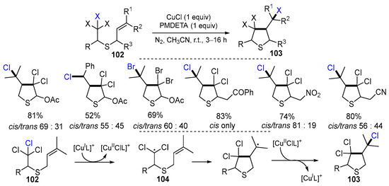 In 2016, Gupta, Soni and their coworkers reported a Cu-promoted radical reaction of 2,2,2-trihaloethylallyl sulfides for the synthesis of highly substituted tetrahydrothiophenes. The reaction of 2,2,2-trihaloethylallyl sulfides 102 with CuCl/PMDETA in CH3CN at room temperature gave products 103 in good to high yields (Scheme 26) [52]. Initial radicals 104 generated from the reaction of 2,2,2-trihaloethylallyl sulfides 102 with [CuIL]+ undergo 5-exo cyclization followed by the reaction with [CuIIClL]+ to give products 103.