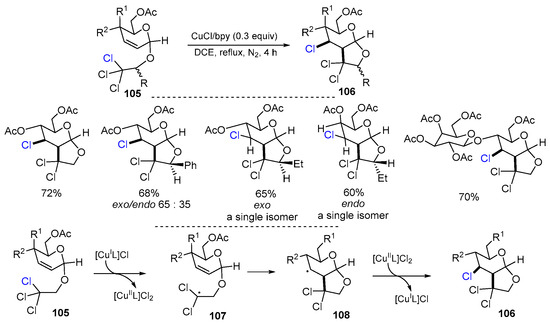 In 2017, Gupta and coworkers reported a Cu-catalyzed radical cyclization reaction of unsaturated carbohydrate-derived chloroacetals for the synthesis of chlorinated perhydrofuro[2,3-b]pyrans. The reaction of chloroacetals 105 with CuCl/2,2’-bipyridine in refluxing dichloroehtane (DCE) under N2 atmosphere for 4 h gave products 106 in good yields (Scheme 27) [53]. The initial radicals 107 generated from 105 via abstraction of a chlorine atom by [CuIL]Cl undergo 5-endo-cyclization to give radicals 108 which then react with [CuIIL]Cl2 to form products 106.