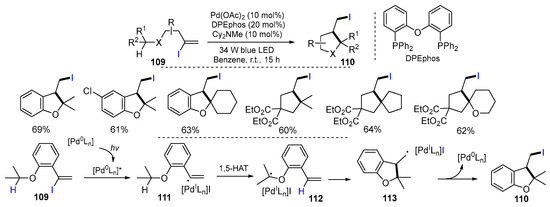 Presented in this section are the ATRC reactions using the substrates which are not included in the previous sections. The transfer groups X could be unique carbonate, pyridinyl, xanthyl, and TEMPO-related groups. Similar to the halogen atoms, these groups are good for homolytic cleavage to generate radicals for ATRC reactions. Gevorgyan and coworkers in 2018 reported a Pd-catalyzed radical reaction of iodovinyl derivatives for the synthesis of cyclic compounds. The reaction of iodovinyl derivatives 109 in the presence of Pd(OAc)2, DPEphos and Cy2NMe under the irradiation of 34 W blue LEDs in benzene afforded products 110 in good to excellent yields (Scheme 28) [54]. The reaction first generates Pd-radical intermediates 111 via a SET process of vinyl iodides 109 with the active [Pd0Ln]*. After 1,5-HAT (hydrogen atom transfer) of 111 to form 112 followed by a 5-exo cyclization give radicals 113, these undergo reductive elimination of [Pd0Ln] to give products 110.