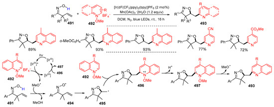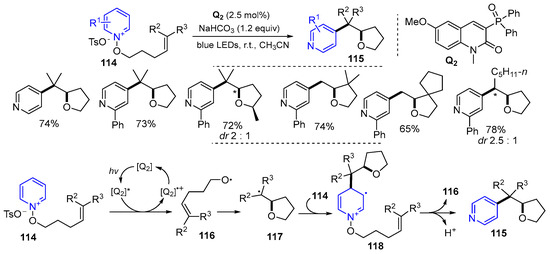 A unique ATRC reaction involving the pyridinyl group was reported by Hong and coworkers in 2019. They developed a visible-light-induced radical reaction of N-alkenyloxypyridinium salts for the synthesis of pyridine-tethered tetrahydrofurans. The reaction of N-alkenyloxypyridinium salts 114 in the presence of 3-phosphonated quinolinone (Q2) and NaHCO3 under the irradiation of blue LEDs at room temperature gave products 115 in good yields (Scheme 29) [55].