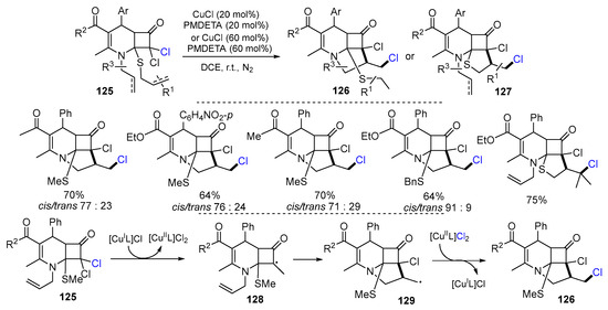 A Cu-catalyzed radical reaction of allyl bicyclic β-lactam for the synthesis of tricyclic β-lactams has been reported by Dawra and coworkers in 2020. The reaction of allyl bicyclic β-lactam 125 under the catalysis of CuCl/PMDETA in DCE at room temperature gave products 126 or 127 in good to excellent yields (Scheme 31) [57]. Between two alkenyl groups (S-allyl and N-allyl) the competitive experiments revealed that the ATRC is more favorable to the S-allyl group than the N-allyl group. It was suggested that radicals 128 formed via the abstraction of a Cl atom of 125 by [CuIL]Cl undergo a 5-exo cyclization to give radicals 129 which then react with [CuIIL]Cl2 to give products 126.
