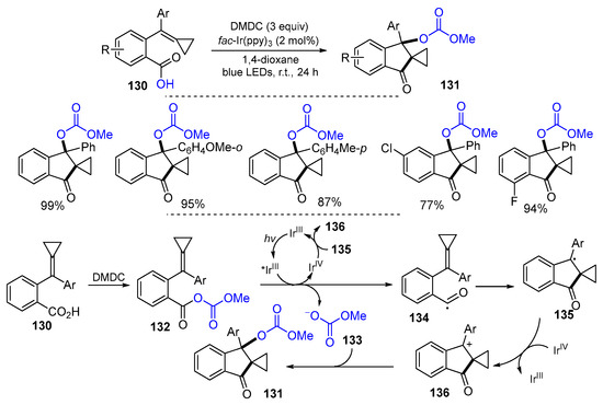 - Wei, H.-Z.; Wei, Y.; Shi, M. Intramolecular difunctionalization of methylenecyclopropanes tethered with carboxylic acid by visible-light photoredox catalysis. Org. Chem. Front. 2021, 8, 4527–4532. [Google Scholar] [CrossRef]