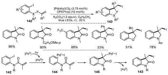- Marchese, A.D.; Durant, A.G.; Reid, C.M.; Jans, C.; Arora, R.; Lautens, M. Pd(0)/blue light promoted carboiodination reaction-evidence for reversible C–I bond formation via a radical pathway. J. Am. Chem. Soc. 2022, 144, 20554–20560. [Google Scholar] [CrossRef] [PubMed]