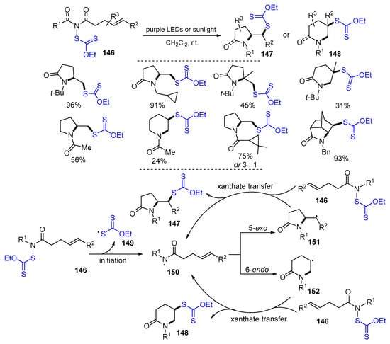 - Zhou, T.; Chen, H.; Liu, Y.; Wang, H.; Yan, Q.; Wang, W.; Chen, F. Visible-light-promoted xanthate-transfer cyclization reactions of unactivated olefins under photocatalyst- and additive-free conditions. J. Org. Chem. 2022, 87, 15582–15597. [Google Scholar] [CrossRef] [PubMed]