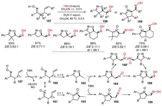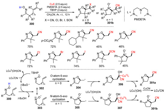 - Chen, F.; Zhu, F.-F.; Zhang, M.; Liu, R.-H.; Yu, W.; Han, B. Iminoxyl radical-promoted oxycyanation and aminocyanation of unactivated alkenes: Synthesis of cyano-featured isoxazolines and cyclic nitrones. Org. Lett. 2017, 19, 3255–3258. [Google Scholar] [CrossRef] [PubMed]