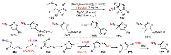- Wang, D.-J.; Chen, B.-Y.; Wang, Y.-Q.; Zhang, X.-W. Ruthenium-catalyzed direct transformation of alkenyl oximes to 5-cyanated isoxazolines: A cascade approach based on non-stabilized radical intermediate. Eur. J. Org. Chem. 2018, 2018, 1342–1346. [Google Scholar] [CrossRef]