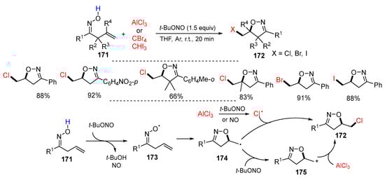 - Yang, X.-L.; Long, Y.; Chen, F.; Han, B. Synthesis of isoxazoline-featured oxindoles by iminoxyl radical-promoted cascade oxyalkylation/alkylarylation of alkenes. Org. Chem. Front. 2016, 3, 184–189. [Google Scholar] [CrossRef]