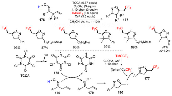 - Zhang, W.; Su, Y.; Wang, K.-H.; Wu, L.; Chang, B.; Shi, Y.; Huang, D.; Hu, Y. Trichloroisocyanuric acid promoted cascade cyclization/trifluoromethylation of allylic oximes: Synthesis of trifluoromethylated ioxazolines. Org. Lett. 2017, 19, 376–379. [Google Scholar] [CrossRef] [PubMed]