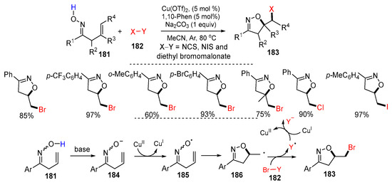 - Li, X.; Ding, Y.; Qian, L.; Gao, Y.; Wang, X.; Yan, X.; Xu, X. General 5-halomethyl isoxazoline synthesis enabled by copper-catalyzed oxyhalogenation of alkenes. J. Org. Chem. 2019, 84, 12656–12663. [Google Scholar] [CrossRef] [PubMed]