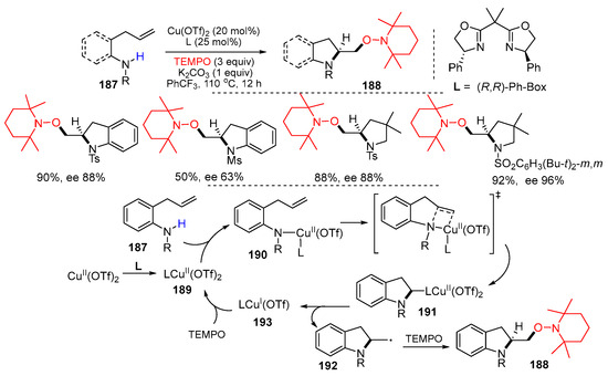 - Paderes, M.C.; Keister, J.B.; Chemler, S.R. Mechanistic analysis and optimization of the copper-catalyzed enantioselective intramolecular alkene aminooxygenation. J. Org. Chem. 2013, 78, 506–515. [Google Scholar] [CrossRef] [PubMed]