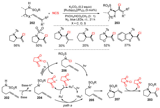 - Azzi, E.; Ghigo, G.; Sarasino, L.; Parisotto, S.; Moro, R.; Renzi, P.; Deagostino, A. Photoinduced chloroamination cyclization cascade with N-chlorosuccinimide: From N-(allenyl)sulfonylamides to 2-(1-chlorovinyl)pyrrolidines. J. Org. Chem. 2023, 88, 6420–6433. [Google Scholar] [CrossRef] [PubMed]