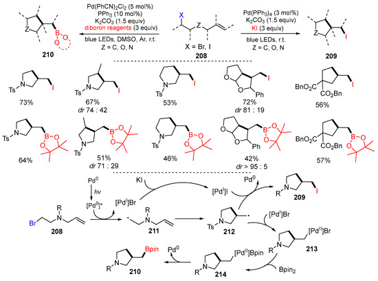 - Ma, J.-W.; Chen, X.; Zhou, Z.-Z.; Liang, Y.-M. Visible-light-induced palladium-catalyzed carbocyclization of unactivated alkyl bromides with alkenes involving C–I or C–B coupling. J. Org. Chem. 2020, 85, 9301–9312. [Google Scholar] [CrossRef] [PubMed]