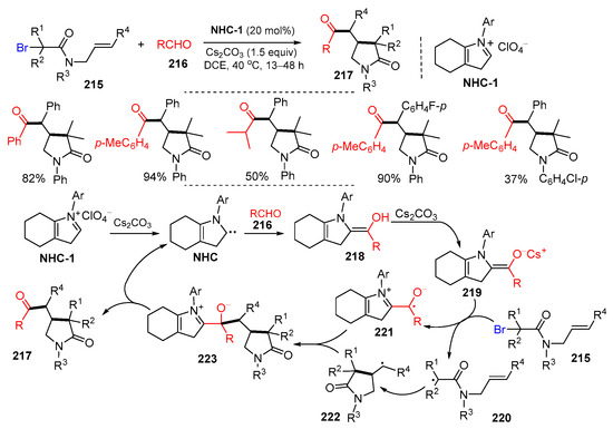 - Yin, H.; Huang, T.; Shi, B.; Cao, W.; Yu, C.; Li, T.; Zhang, K.; Yao, C. Synthesis of 2-pyrrolidinone derivatives via N-heterocyclic carbene catalyzed radical tandem cyclization/coupling reactions. Org. Chem. Front. 2023, 10, 2695–2700. [Google Scholar] [CrossRef]