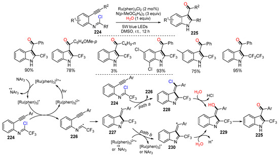 - Dong, X.; Hu, Y.; Xiao, T.; Zhou, L. Synthesis of 2-trifluoromethyl indoles via visible-light induced intramolecular radical cyclization. RSC Adv. 2015, 5, 39625–39629. [Google Scholar] [CrossRef]