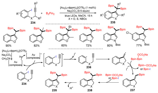 - Zhang, L.; Si, X.; Rominger, F.; Hashmi, A.S.K. Visible-light-induced radical carbo-cyclization/gem-diborylation through triplet energy transfer between a gold catalyst and aryl iodides. J. Am. Chem. Soc. 2020, 142, 10485–10493. [Google Scholar] [CrossRef] [PubMed]