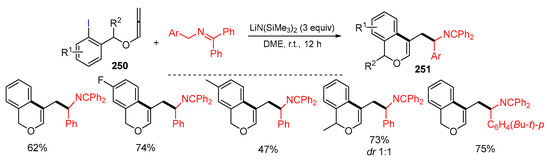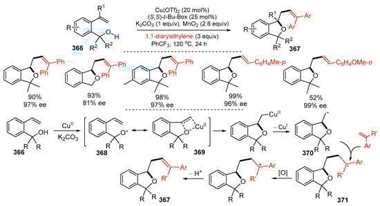 - Yu, K.; Li, M.; Deng, G.; Liu, C.; Wang, J.; Liu, Z.; Zhang, H.; Yang, X.; Walsh, P.J. An efficient route to isochromene derivatives via cascade radical cyclization and radical-radical coupling. Adv. Synth. Catal. 2019, 361, 4354–4359. [Google Scholar] [CrossRef]