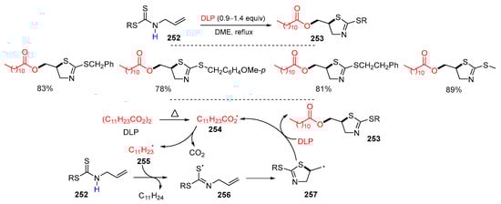 - Kakaeia, S.; Xu, J. Synthesis of (2-alkylthiothiazolin-5-yl)methyl dodecanoates via tandem radical reaction. Org. Biomol. Chem. 2013, 11, 5481–5490. [Google Scholar] [CrossRef] [PubMed]