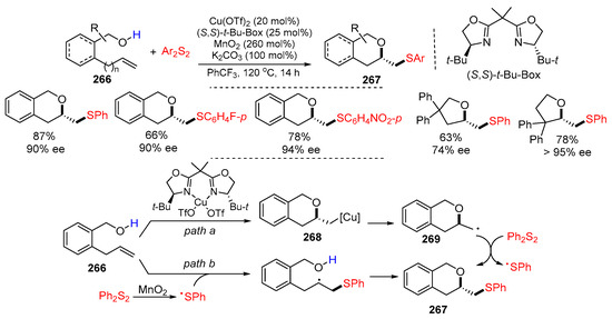 - Burde, A.S.; Chemler, S.R. Copper-catalyzed enantioselective oxysulfenylation of alkenols: Synthesis of arylthiomethyl-substituted cyclic ethers. ACS Catal. 2022, 12, 7559–7564. [Google Scholar] [CrossRef] [PubMed]