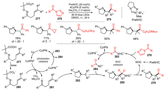 - Dong, Y.-X.; Zhang, C.-L.; Gao, Z.-H.; Ye, S. Iminoacylation of alkenes via photoredox N-heterocyclic carbene catalysis. Org. Lett. 2023, 25, 855–860. [Google Scholar] [CrossRef]