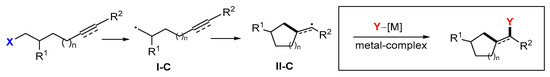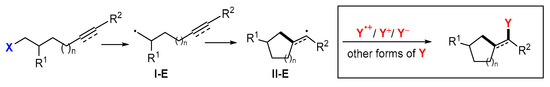 Radical difunctionalization is an attractive topic due to its advantages of synthetic efficiency and product structure diversity. There are a number of reviews on this topic [15,16,17,18,19,20,21,22,23,24,25]. In our recent review articles, we highlighted 1,2-difunctionalization of alkenes and alkynes (Scheme 1, I) [26], remote 1,3-, 1,4-, 1,5-, 1,6- and 1,7-difunctionalization of alkenes and alkynes (Scheme 1, II) [27], and addition/cyclization sequence of dienes, enynes and related compounds (Scheme 1, III) [28]. Presented in this paper are radical cyclization-initiated reactions followed by the second functionalization for the synthesis of cyclic compounds (Scheme 1, IV). It covers the work of the past decade, but most are from the last five years. The second functionalization reaction could be accomplished by atom transfer reactions, radical or transition metal coupling reactions, and reactions involving neutral molecules, cationic and anionic species (Scheme 2). In the reaction process, radical cyclization is considered the first functionalization, while the introduction of X or Y groups is the second functionalization.