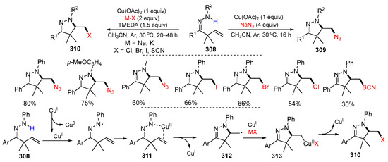 - Wang, L.-J.; Ren, P.-X.; Qi, L.; Chen, M.; Lu, Y.-L.; Zhao, J.-Y.; Liu, R.; Chen, J.-M.; Li, W. Copper-mediated aminoazidation, aminohalogenation, and aminothiocyanation of β,γ-unsaturated hydrazones: Synthesis of versatile functionalized pyrazolines. Org. Lett. 2018, 20, 4411–4415. [Google Scholar] [CrossRef] [PubMed]