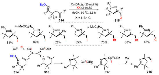 - Chen, C.; Ding, J.; Wang, Y.; Shi, X.; Jiao, D.; Zhu, B. Copper-catalyzed iminohalogenation of γ, δ-unsaturated oxime esters with halide salts: Synthesis of 2-halomethyl pyrrolines. Tetrahedron Lett. 2019, 60, 151000. [Google Scholar] [CrossRef]