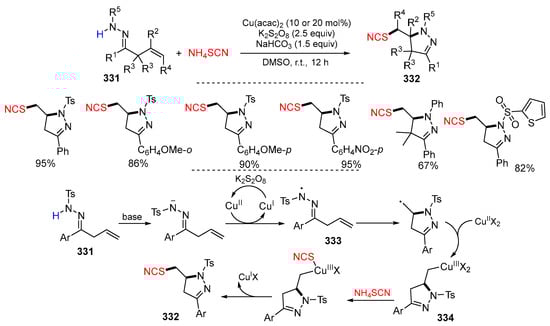 - Meng, F.; Zhang, H.; He, H.; Xu, N.; Fang, Q.; Guo, K.; Cao, S.; Shi, Y.; Zhu, Y. Copper-catalyzed domino cyclization/thiocyanation of unactivated olefins: Access to SCN-containing pyrazolines. Adv. Synth. Catal. 2020, 362, 248–254. [Google Scholar] [CrossRef]
