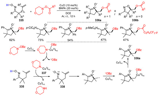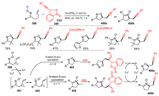 - Han, W.-J.; Wang, Y.-R.; Zhang, J.-W.; Chen, F.; Zhou, B.; Han, B. Cu-catalyzed oxyalkynylation and aminoalkynylation of unactivated alkenes: Synthesis of alkynyl-featured isoxazolines and cyclic nitrones. Org. Lett. 2018, 20, 2960–2963. [Google Scholar] [CrossRef] [PubMed]