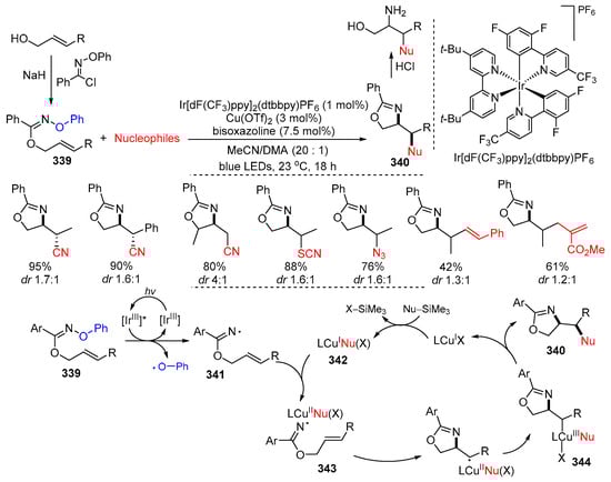 - Zhang, Z.; Ngo, D.T.; Nagib, D.A. Regioselective radical amino-functionalizations of allyl alcohols via dual catalytic cross-coupling. ACS Catal. 2021, 11, 3473–3477. [Google Scholar] [CrossRef] [PubMed]