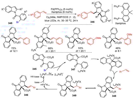 - Chen, S.; Meervelt, L.V.; Van der Eycken, E.V.; Sharma, U.K. Visible-light-driven palladium-catalyzed radical tandem dearomatization of indoles with unactivated alkenes. Org. Lett. 2022, 24, 1213–1218. [Google Scholar] [CrossRef] [PubMed]