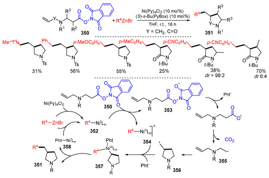 - Nieto-Carmona, J.C.; Román, R.S.; Buñuel, E.; Cárdenas, D.J. Nickel-catalyzed cascade cyclization-Negishi coupling of redox active esters for the synthesis of pyrrolidines. Eur. J. Org. Chem. 2022, 2022, e202200992. [Google Scholar] [CrossRef]